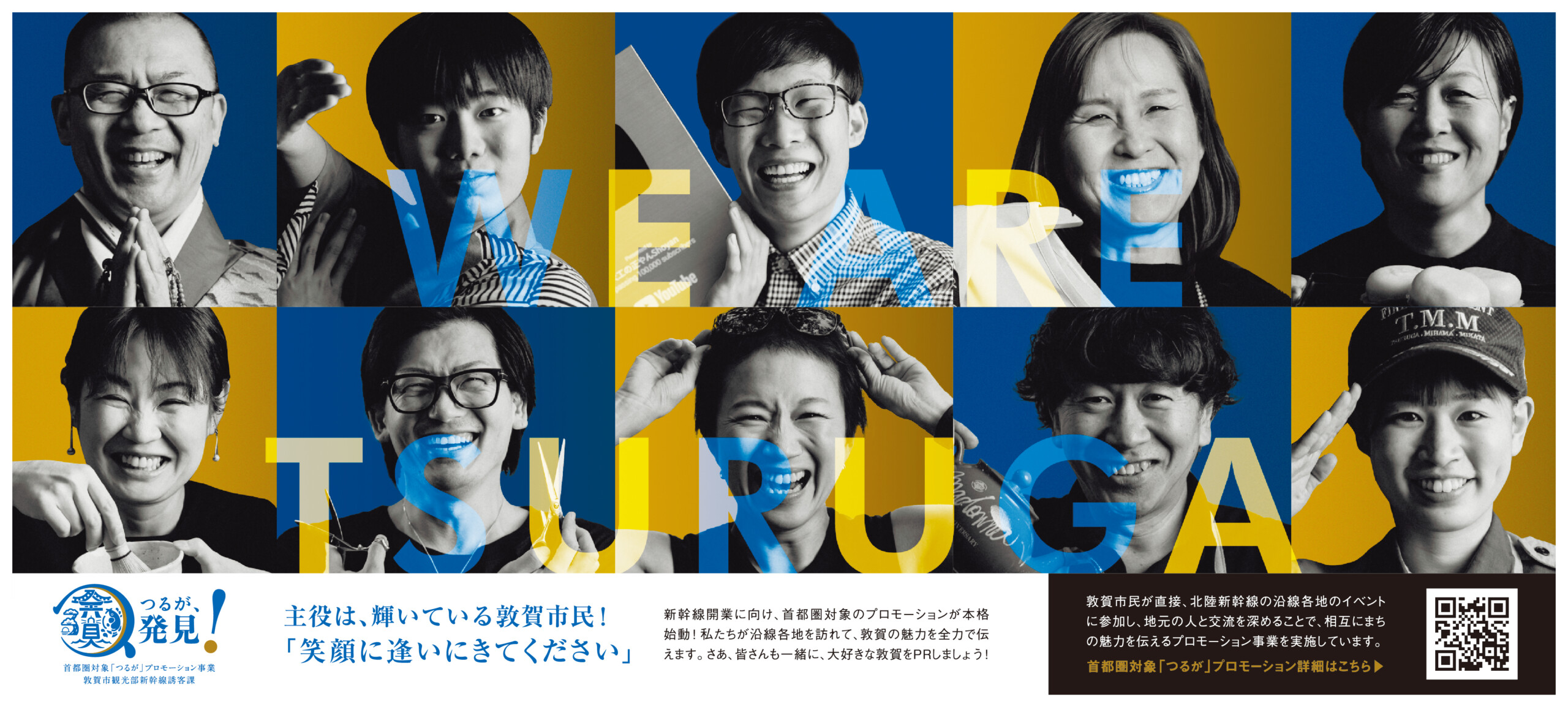 2023年12月7日付 福井新聞掲載 敦賀プロモーション新聞広告 CATEGORIESメディアデザイン敦賀市で行っているまちの魅力を伝えるプロモーションをPRするための広告で、敦賀市民の皆さんが街を盛り上げる!と一致団結している顔が見える様にデザインしました。写真はあえてモノクロ、背景色は「つるが発見!」のロゴのメインカラーを使用して皆さんの笑顔が印象に残るようにしました。□□□□□□□□□□□□□□Client:福井新聞社様Director:高山友樹Design:川尻夏純Cameraman:Eito MarsCopywriter:鷹谷信隆□□□□□□□□□□□□□□ Post Share LINE Pin it note