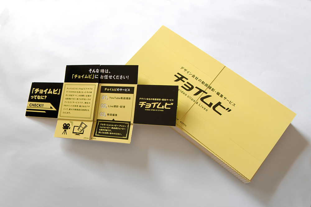 チョイムビリーフレット チョイムビリーフレット チョイムビリーフレット 「チョイムビ」リーフレット CATEGORIES印刷物デザイン「チョイムビ」リーフレット弊社の動画撮影・LIVE配信サービス「チョイムビ」のリーフレットを制作いたしました。折りたたむと形がどんどん変わっていく、永遠にめくれる面白い仕組みのリーフレットです。Client:he/rbestDesign:池田実央動画撮影・LIVE配信サービス「チョイムビ」の詳細は、下記バナーよりどうぞ! Post Share LINE Pin it note